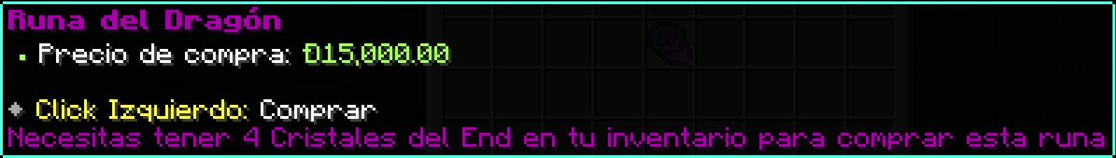 Al abrir el panel de objetos especiales podrás observar la Runa del Dragon con su precio y descripción de requisitos para poder utilizarlo, como se a mencionado anterior mente es necesario como requisito tener los 4 cristales del end en el inventario.